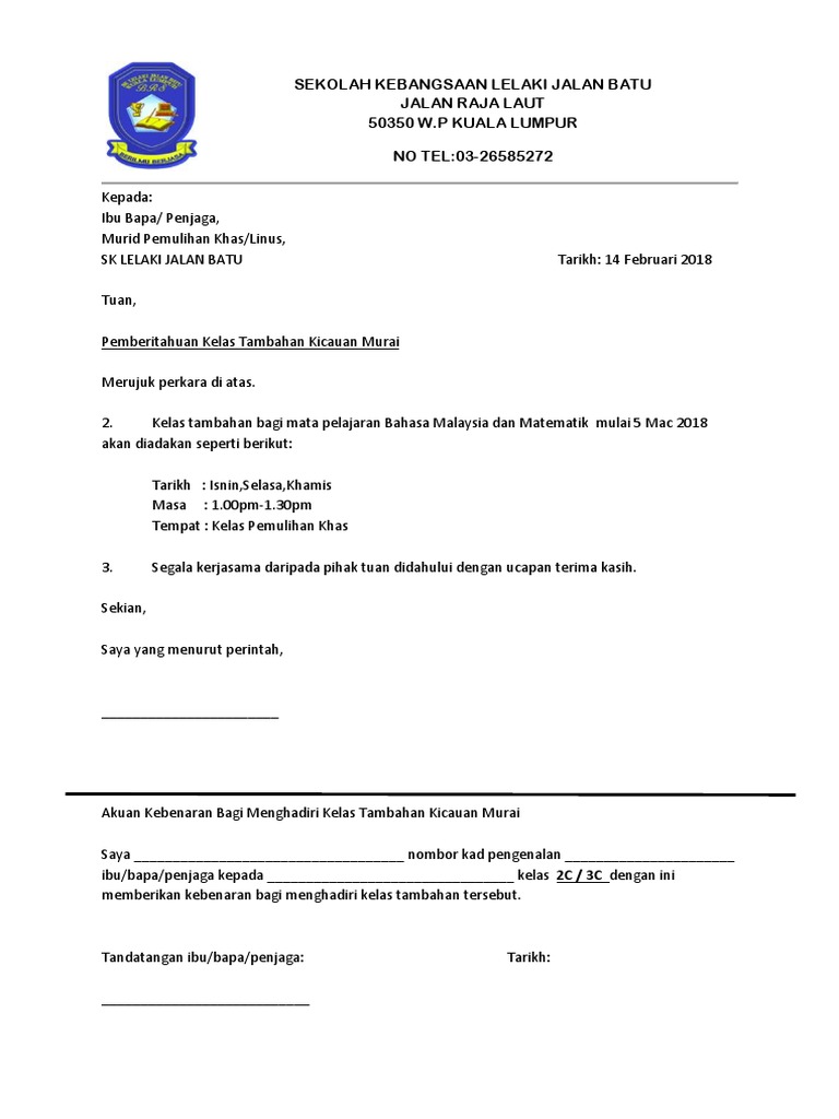 Contoh Surat Makluman Kelas Tambahan Linus Pdf
